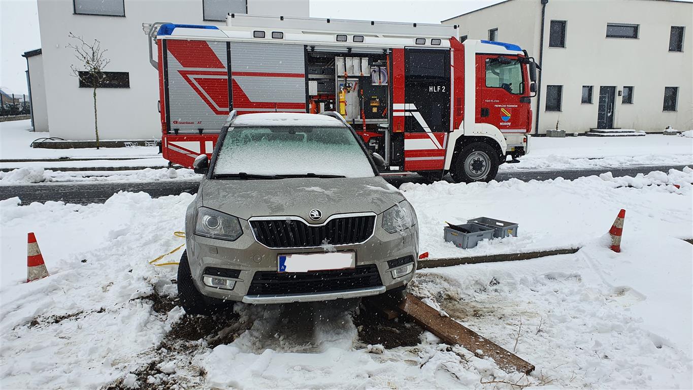 Der erste stärkere Schneefall machte sich auch in unserer Gemeinde bemerkbar. Am Nachmittag des 09.12. wurde einem ortsunkundigen Lenker die frische Schneedecke und die Kombination der noch nicht fertig gestellten Parkplätze in der Gartenstrasse zum Verhängnis.